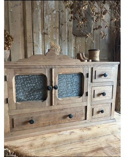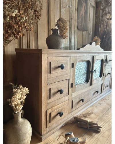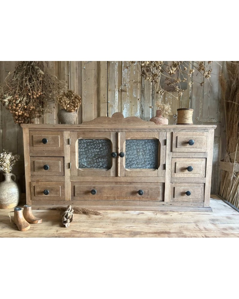 Ce joli meuble ancien séduit par son allure authentique et ses détails uniques. Avec ses sept tiroirs encadrant deux portes centrales vitrées au verre martelé d’époque, il raconte l’histoire du temps passé. La vitre gauche présente une légère fêlure, mais loin d’enlever à sa beauté, elle lui confère ce supplément d’âme et ce charme fou que seul l’ancien sait offrir.