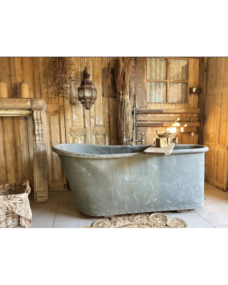 Posée sur son plateau en bois d’origine, montée sur ses roulettes anciennes, cette baignoire en zinc incarne l’authenticité et la poésie des objets d’antan.