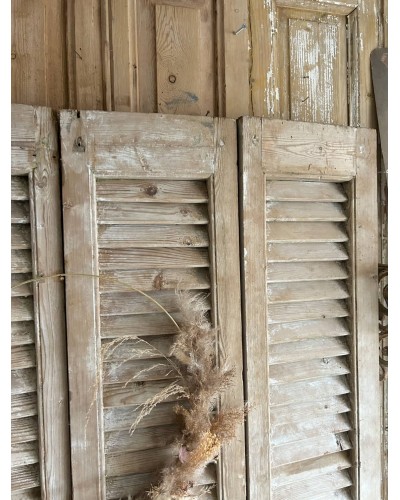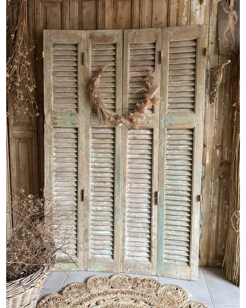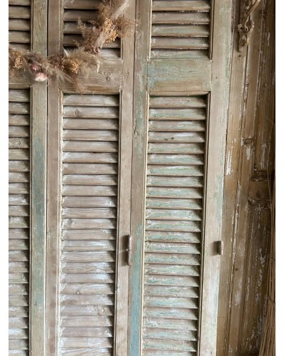 Sublime paire de volets à persiennes, issus d’un ancien château, conservant leur patine naturelle et leurs nuances de vert passé.