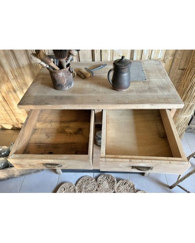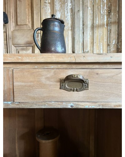 À l’arrière, deux tiroirs gravés de jolies poignées patinées par le temps offrent un espace précieux pour ranger les secrets du quotidien: papiers, carnets, petites pièces et trésors cachés. En dessous, un espace ouvert de rangement s’étire, prêt à accueillir des paniers de produits, des fiches de comptabilité ou des objets décoratifs qui racontent une histoire.