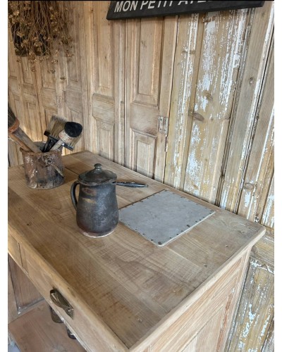 Ses lignes simples et son charme patiné en font une pièce passe-partout: il peut devenir un îlot central dans un petit espace, un comptoir de commerce authentique ou encore un meuble d’entrée chargé de caractère. Sa taille délicatement modulable s’intègre sans contrainte, ajoutant une note chaleureuse et fonctionnelle à n’importe quelle pièce.