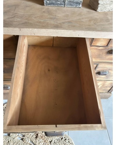Ce charmant meuble de métier, authentique et plein de caractère, allie histoire et élégance. Composé de 15 tiroirs spacieux, chacun doté de poignées coquille d'origine et de portes-étiquettes pour une organisation pratique et esthétique. Sa patine dorée lui confère une allure chaleureuse et raffinée, mettant en valeur son authenticité.