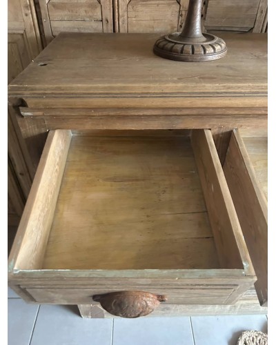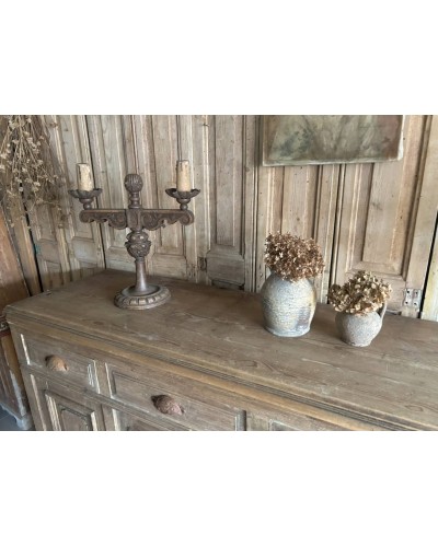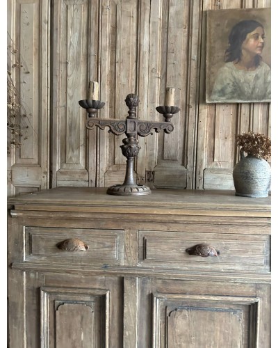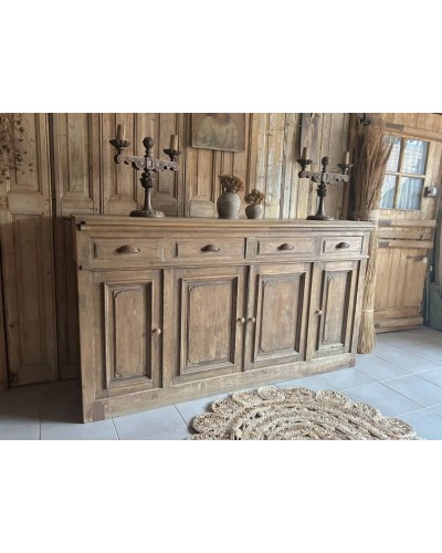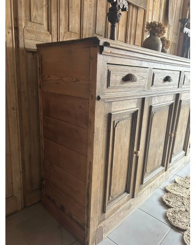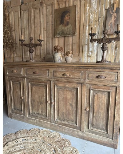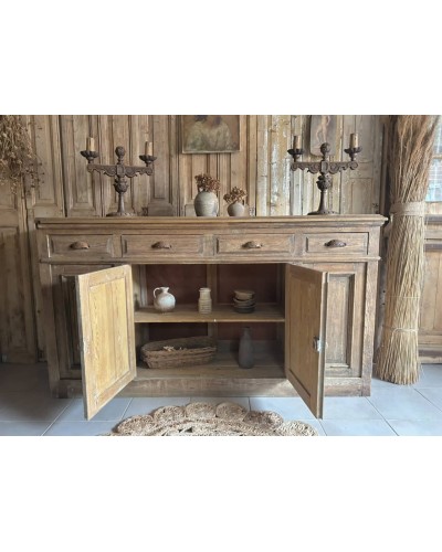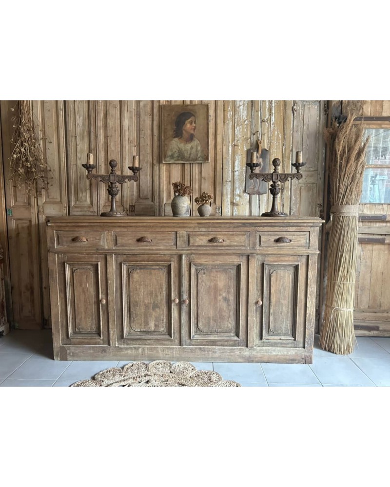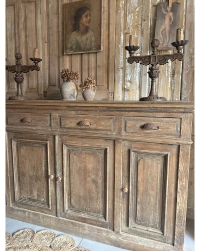 Ce magnifique buffet ancien séduit par sa patine profonde et veloutée, subtilement travaillée pour révéler toute la beauté du bois et les marques du temps.