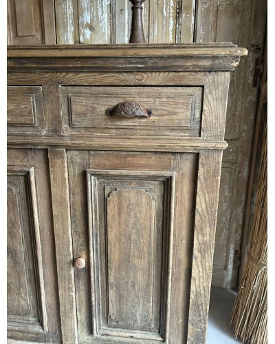À noter : le côté gauche diffère légèrement de la façade, car ce meuble était autrefois accolé à un mur. Il est donc revêtu de planches de bois anciennes, lui conférant un aspect rustique unique.voir photo