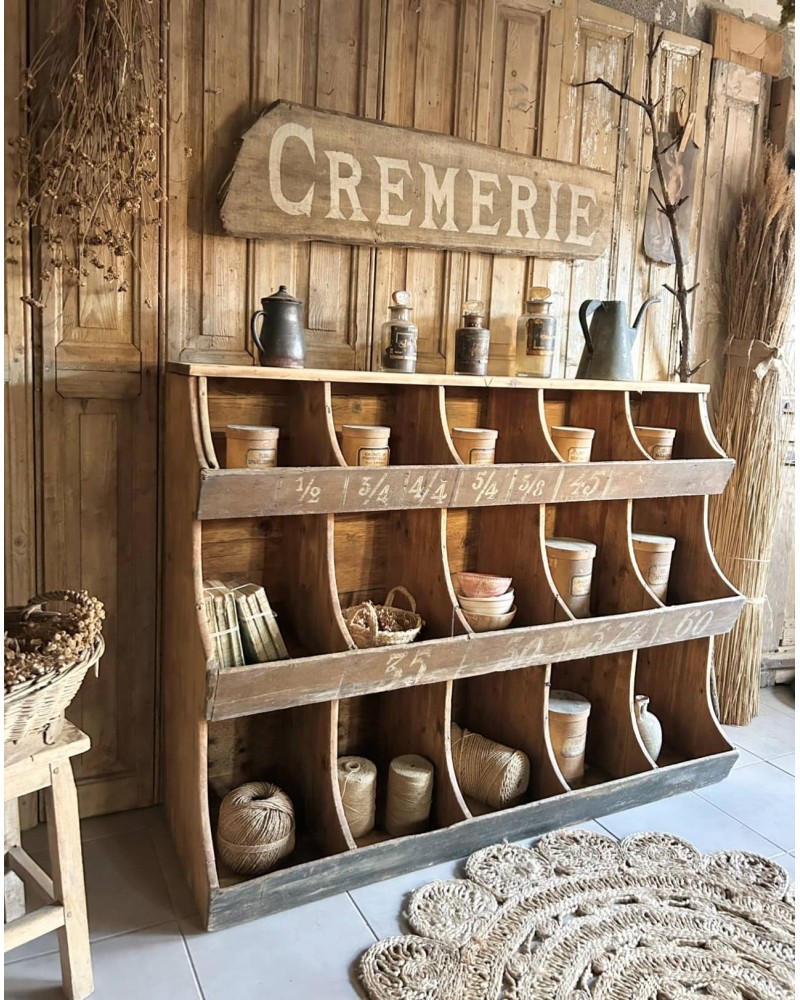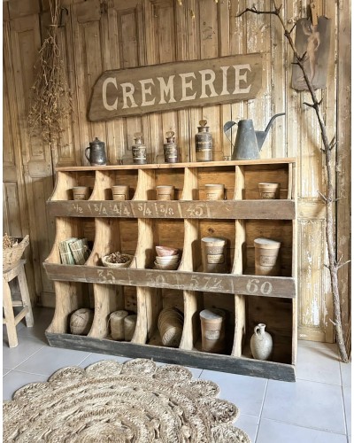 Il est composé d’une grande série de casiers parfaitement alignés, qui offrent une capacité de rangement aussi généreuse que pratique. Chaque compartiment raconte une histoire, comme un héritage des ateliers d’autrefois où l’on conservait graines, outils et petits trésors du quotidien.