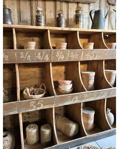 Magnifique meuble grainetier en sapin, entièrement d'origine, composé de plusieurs casiers ouverts avec courbes latérales typiques des anciens mobiliers de commerce. Les chiffres peints à la main sur les traverses (conservé volontairement) confirment son usage professionnel d'époque.