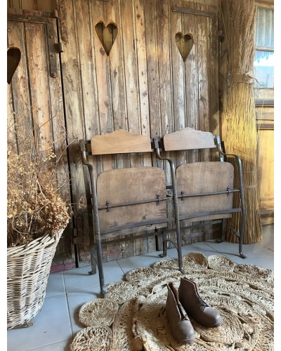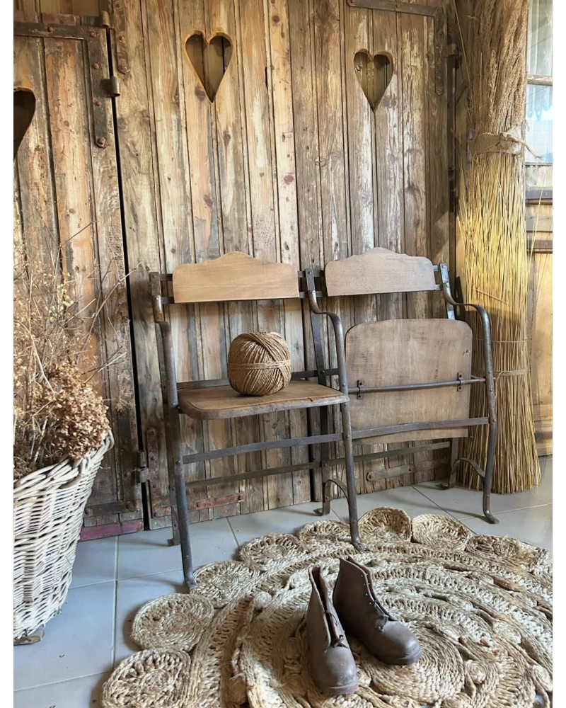Ces deux sièges pliants se répondent comme un couple inséparable : un duo touchant, plein de poésie, parfait pour apporter une note authentique à une entrée, une véranda, un coin lecture ou même une boutique.