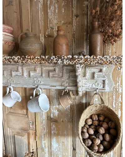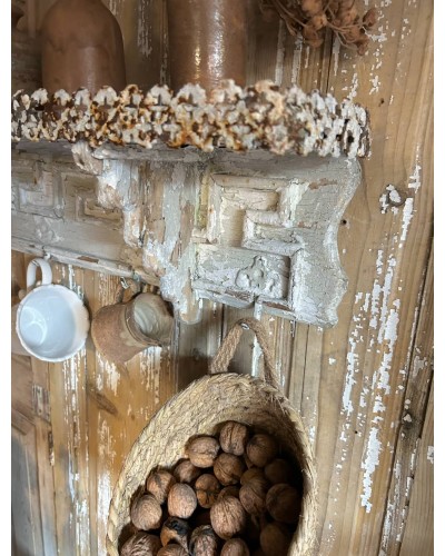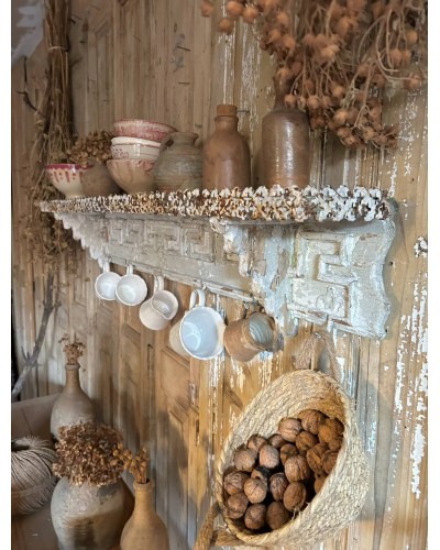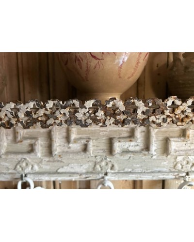Entièrement sculptée, elle dévoile une patine dans les nuances de blanc, profondément authentique, où le bois, la peinture et la rouille légère se mêlent en un relief presque artistique.