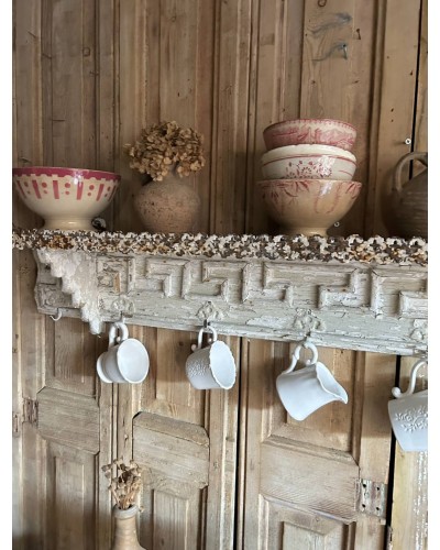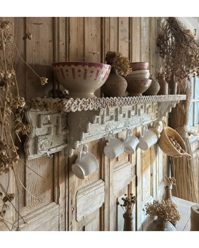 Sous la tablette, de jolis crochets anciens permettent de suspendre tasses, paniers, torchons ou décorations saisonnières, ajoutant à la pièce une touche pratique et poétique.