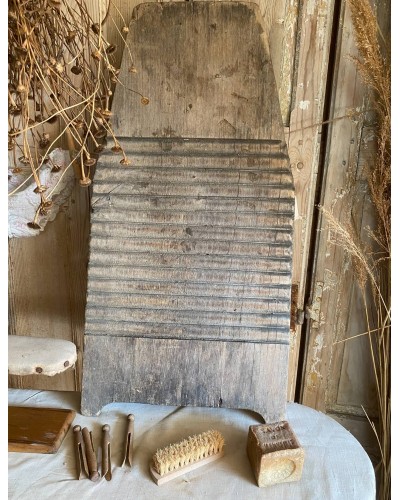 Chargée de mémoire et de gestes d’autrefois, cette ancienne planche à laver en bois révèle une patine authentique, adoucie par le temps et les usages. Son relief nervuré, ses bords arrondis et son bois usé racontent la vie quotidienne d’antan, lorsque chaque objet avait une fonction essentielle et durable.