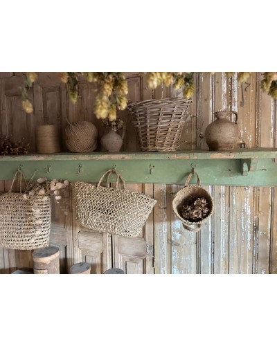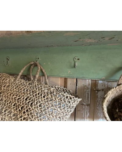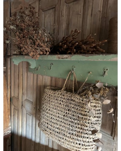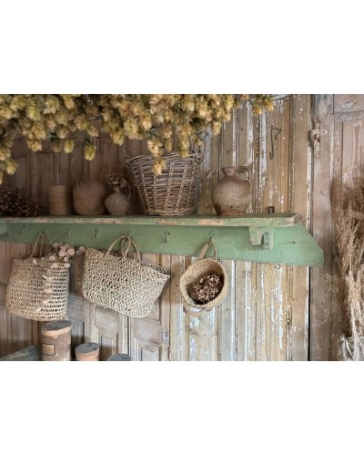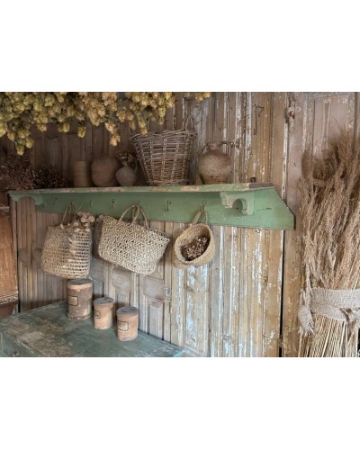 Dotée de patères intégrées, elle est aussi belle que pratique : idéale pour suspendre paniers, torchons anciens, bouquets séchés ou objets du quotidien, tout en offrant un bel espace de présentation sur le dessus.