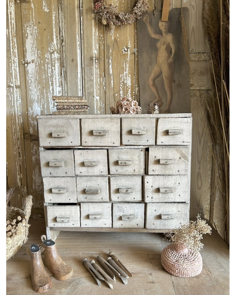 Ses multiples tiroirs, aux façades volontairement irrégulières, offrent un charme brut et profondément poétique. Chacun semble avoir sa propre histoire, avec ses marques, ses aspérités, ses petites imperfections qui font toute la richesse de ce meuble. Les poignées en bois d’origine, simples et robustes, renforcent son caractère artisanal.
