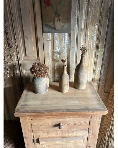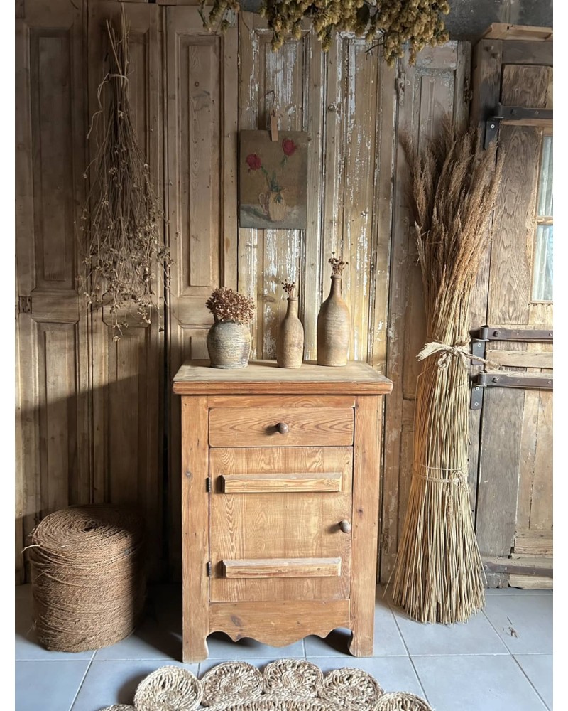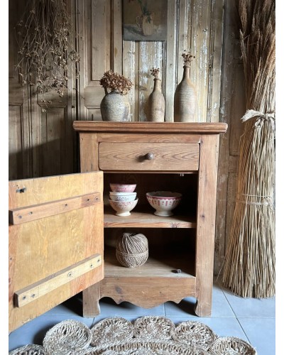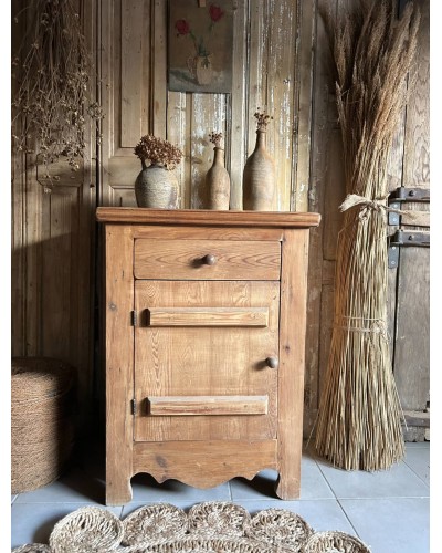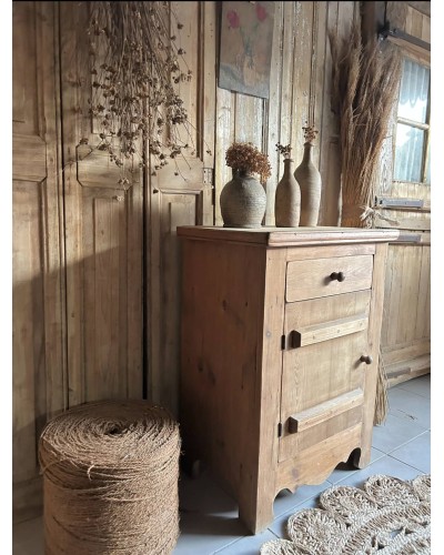 Il se compose d’un tiroir supérieur pratique et d’un espace de rangement fermé par une porte, avec une étagère intérieure idéale pour accueillir vaisselle ancienne, bocaux, linge ou petits trésors du quotidien.