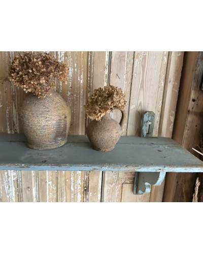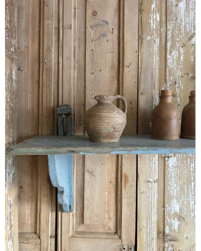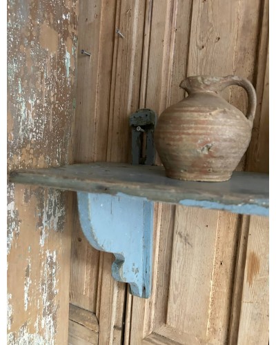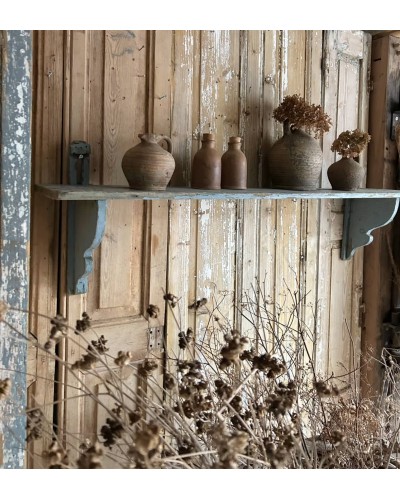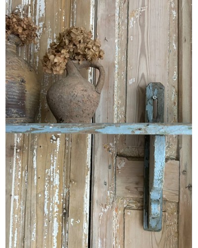 Cette jolie étagère murale ancienne séduit immédiatement par sa patine douce aux nuances bleutées, délicatement usée par le temps.