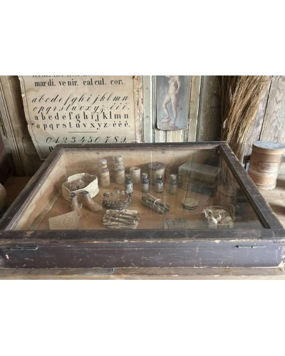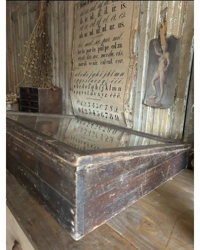 Réalisée en bois (sapin) et dotée d’un couvercle vitré ouvrant, elle était à l’origine destinée à exposer avec soin de petits objets précieux, marchandises fines ou curiosités.