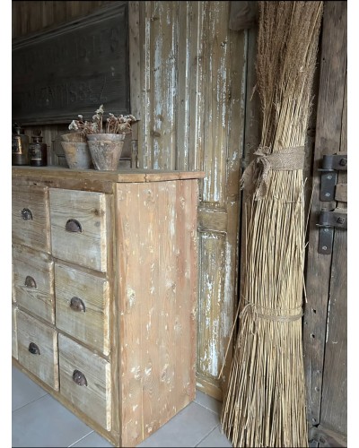 Doté de nombreux tiroirs aux poignées coquille en métal, ce meuble était destiné au rangement méticuleux des petites pièces, outils ou marchandises. Chaque tiroir raconte une histoire, avec ses nuances de bois, ses traces du passé et ses irrégularités pleines de charme.