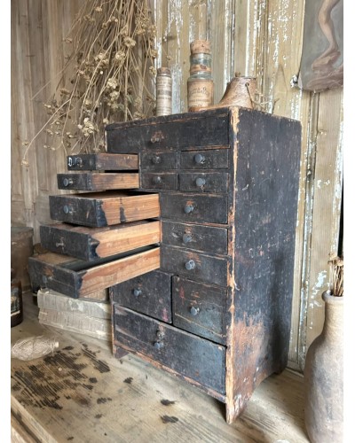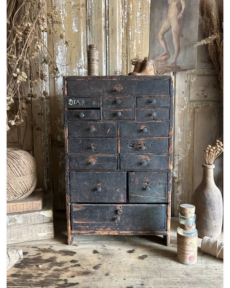 Rare et pleine de charme, cette layette d’horloger au format vertical séduit par sa belle patine noire d’origine, subtilement usée par le temps. Ses nombreux petits tiroirs, non compartimentés, offrent un espace de rangement authentique, idéal pour organiser de précieux trésors, outils ou collections.