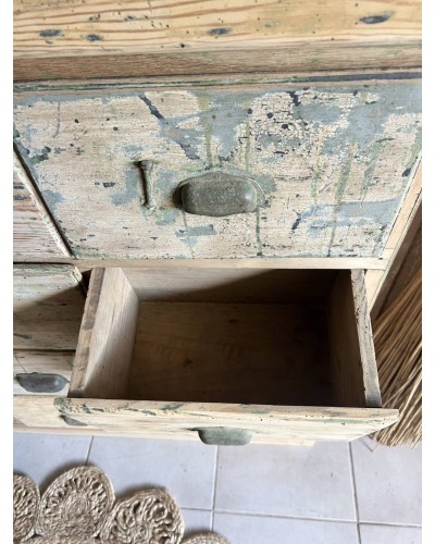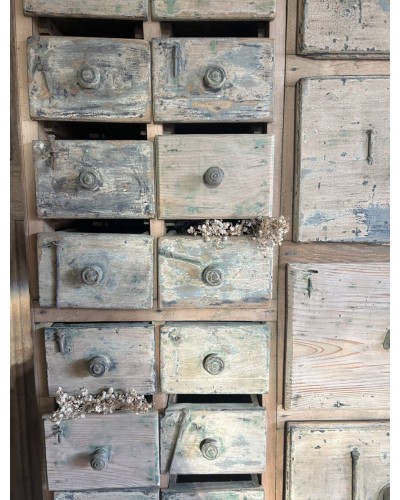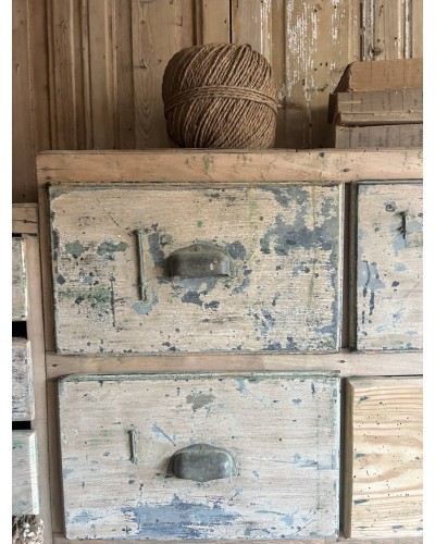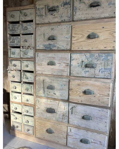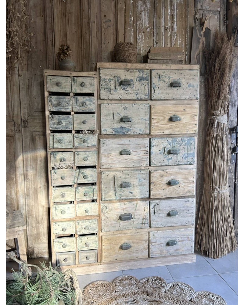 Ancien meuble d’atelier composé de nombreux tiroirs de formats variés, mêlant petits compartiments et larges tiroirs de rangement.