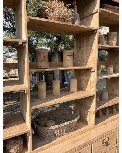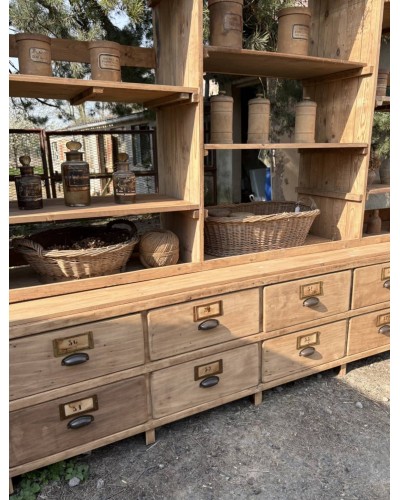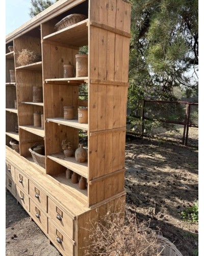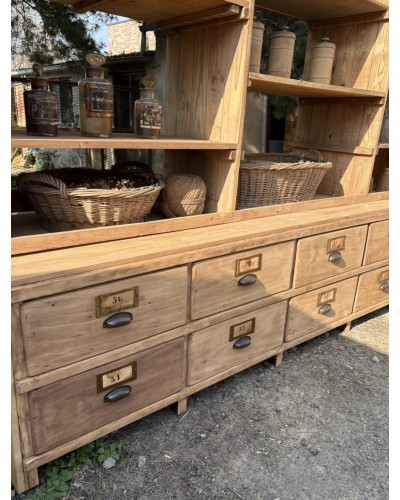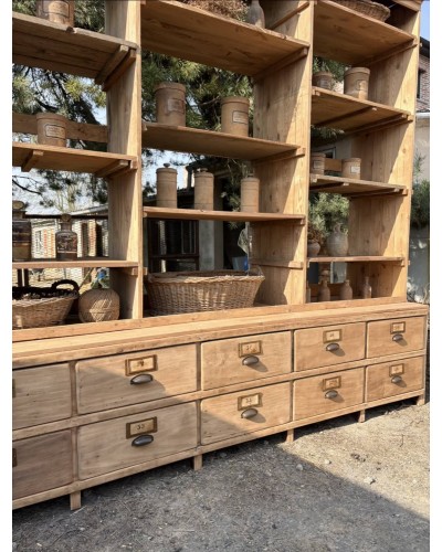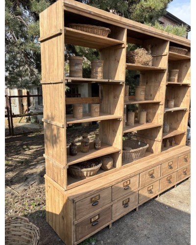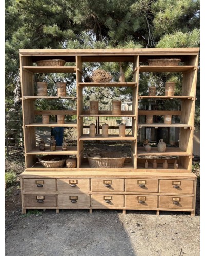 Grand meuble de métier ancien à tiroirs et étagères en bois