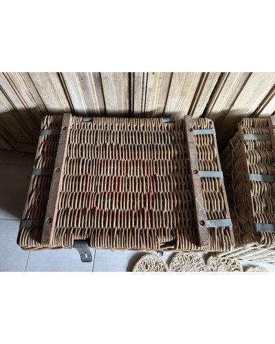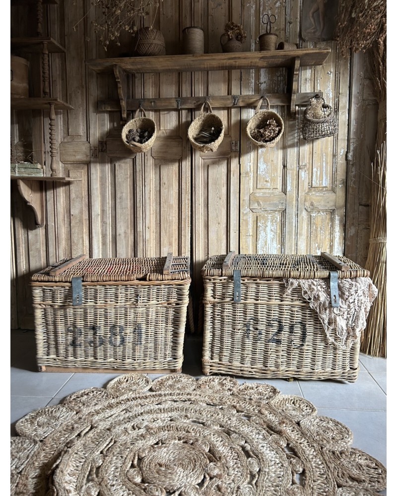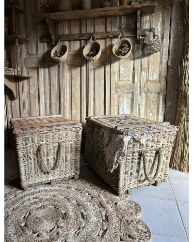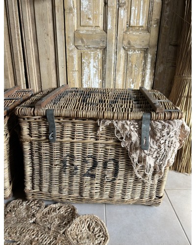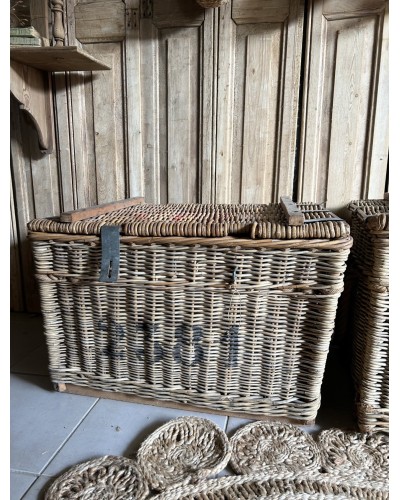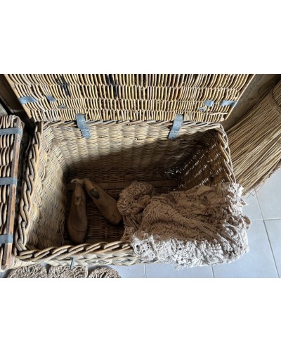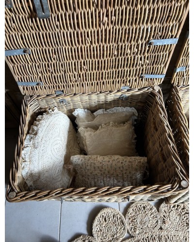 Anciennes malles de déménagement en osier, chargées d’histoire et de vécu.