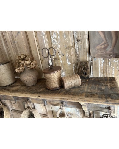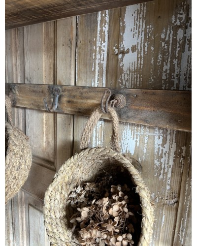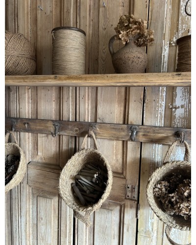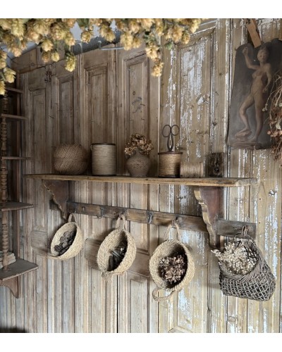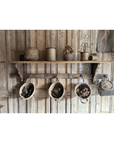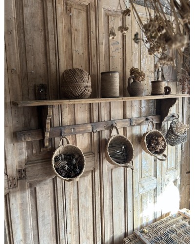 Elle se compose d’une tablette simple et d’une rangée de crochets anciens, parfaite pour suspendre paniers, torchons ou petits objets du quotidien. Ses consoles délicatement travaillées apportent une touche d’élégance tout en conservant son esprit rustique.