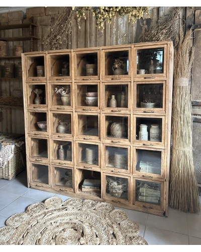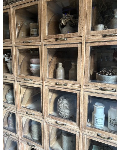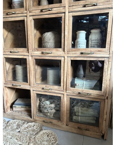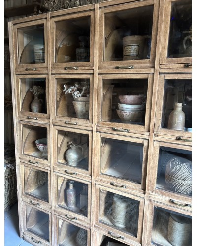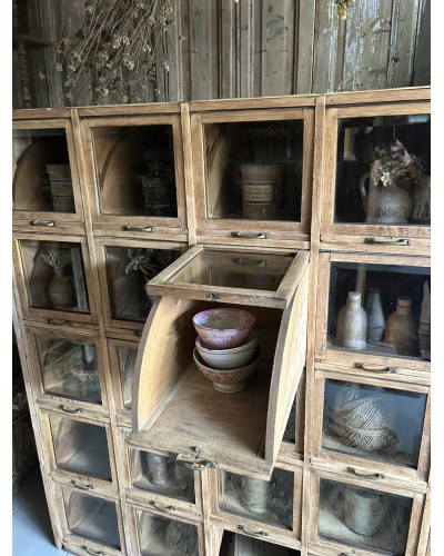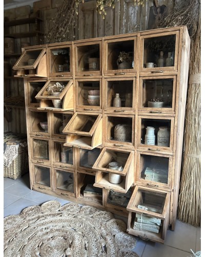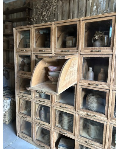 Composé de multiples casiers à clapets vitrés, il offre un jeu à la fois pratique et fascinant : chaque tiroir coulisse parfaitement, le clapet se soulève naturellement à l’ouverture et se referme en douceur lorsqu’on le remet en place. Un mécanisme ancien, simple et ingénieux, qui fait tout son caractère.
