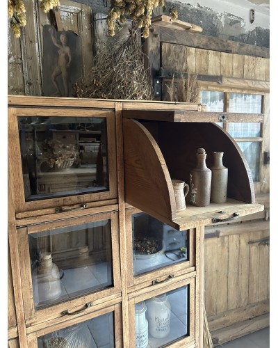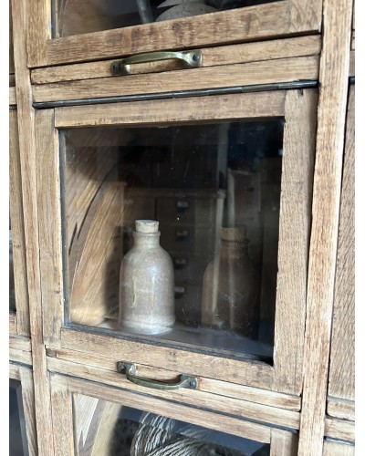 Ancien meuble à clapets vitrés et tiroirs coulissants , meuble de mercerie