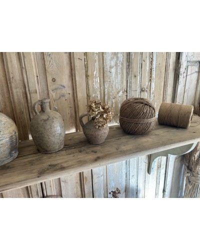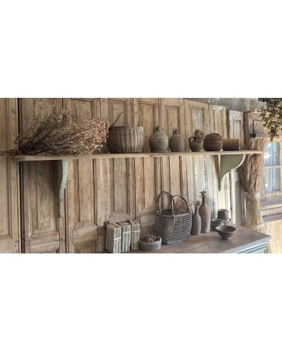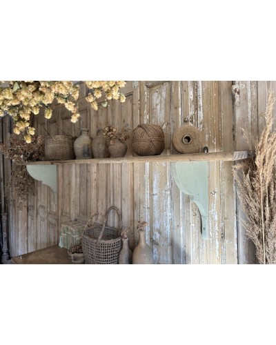 Sa longue planche en bois patiné par le temps révèle de magnifiques nuances naturelles, subtilement marquées par les années. Elle repose sur deux consoles anciennes aux lignes délicatement travaillées, dans une teinte vert d’eau poudrée qui apporte une touche poétique et unique à l’ensemble.